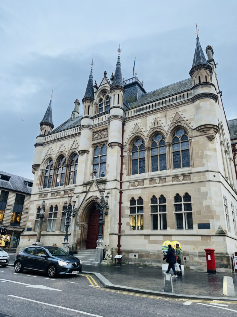 One of the first stops that caught my eye was Inverness Town House on High Street. From the outside, it’s stunning — three grand archways, pointed spires, and ornate details. Learning that it was built in the 1880s by Matthews & Lawrie for £20,000 (millions in today’s money!) made me admire it even more. Originally designed for council meetings and official receptions, the Town House now hosts concerts, exhibitions, and occasional council events.