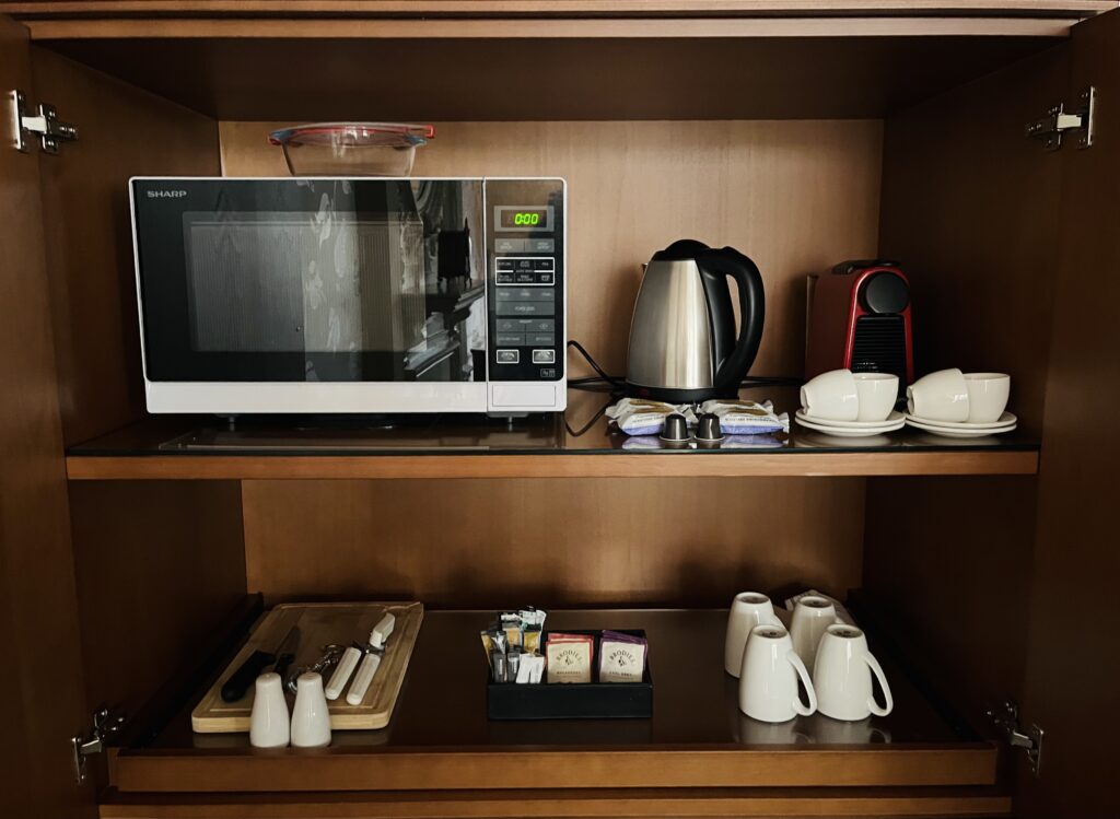 The suite includes a well-equipped kitchenette with a microwave, kettle, coffee, biscuits, and even a cheese board with knife—ideal for preparing light meals or snacks. There’s also a large table, making breakfasts together very comfortable.