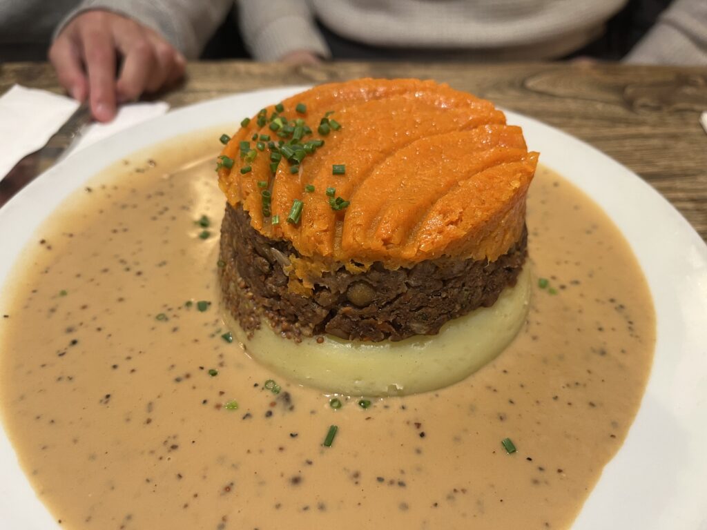 I ordered the full vegetarian haggis mash (bigger than the kids’ version — thank goodness).