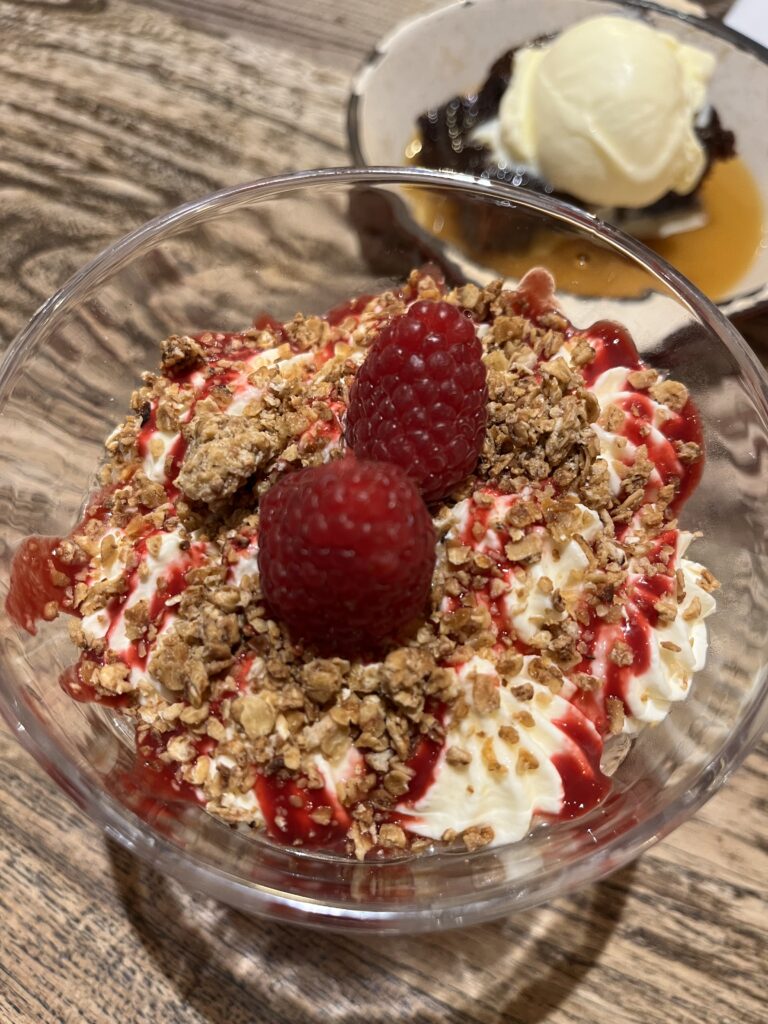 We also tried traditional cranachan — think oats, raspberries, cream, and a hint of whisky. I liked it, though I don’t think I’ll order it every time. It’s a delicate dessert, not heavy, but full of character.