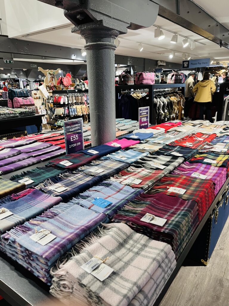While browsing, I caught sight of plush sheep toys, Highland cattle replicas, tartan bags, scarves, and the softest cashmere scarves. A lot of shops carry items priced fairly — a 55-pound cashmere scarf felt like a reasonable treat, considering the quality.