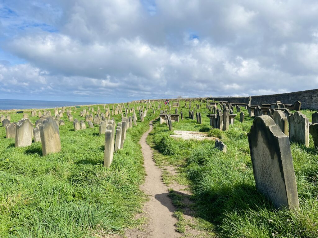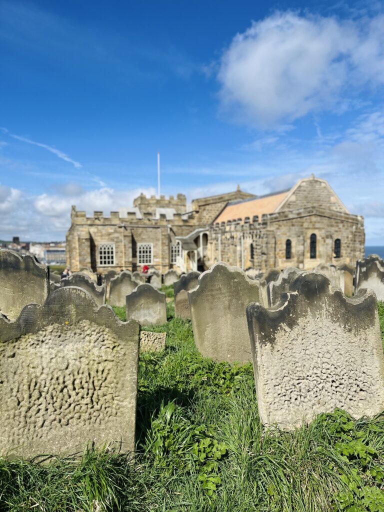 Whitby has always been a town of fishermen and sailors, and this church has long been their spiritual anchor. Inside the church, walls are carved with the names of sailors who never returned. Outside, the gravestones tell their stories — some barely readable after centuries of wind, rain, and salt air.