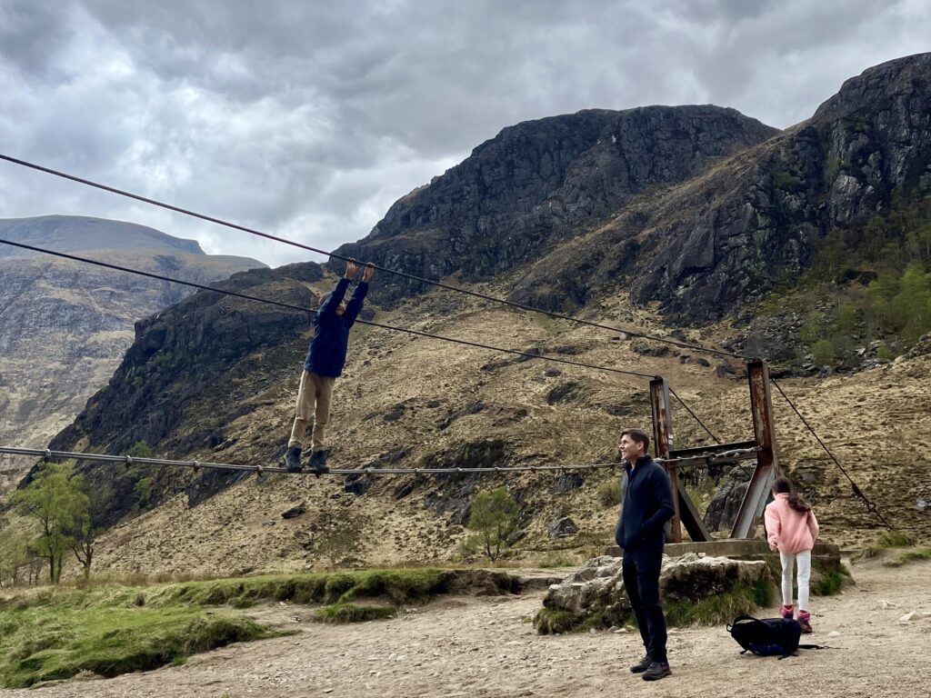 The waterfall, known in Gaelic as An Steall Bàn (“White Waterfall”), plunges 120 metres—making it Scotland’s second tallest. The hike to reach it is thrilling: narrow cliff paths, stepping-stone jumps, and a rope bridge at the end. With kids in tow, it’s an adventure that demands caution but rewards endlessly.