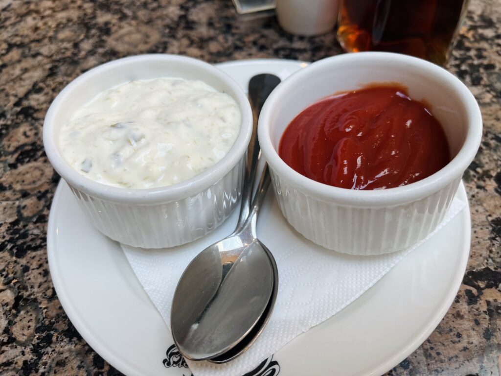 They served tartar sauce and ketchup immediately, and I paired mine with a malt vinegar — oh, that tang just lifts the flavour! I thought: I’ve become a bit more “English” than I expected. The batter was crisp, the fish juicy, the chips golden. Even the sides — mushy peas, baked beans — were spot on. And for a family of four, total was £55.60, which with portions and quality felt very fair. They even gave us a 10% discount coupon for next visit — super sweet touch.